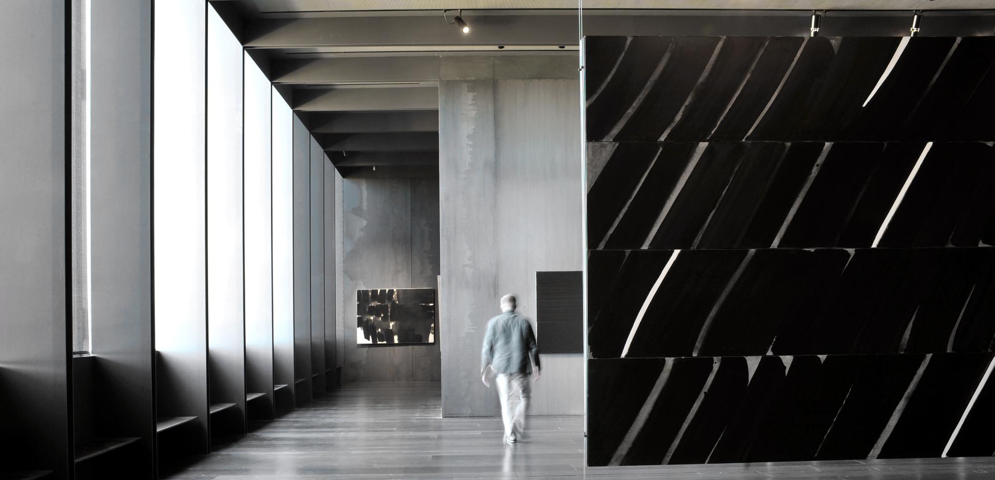 Pierre Soulages, especialmente conocido por su uso de los reflejos del color negro, se exhibe en los museos más importantes del mundo y es uno de los muy pocos artistas que ha tenido una retrospectiva en el Louvre en vida. El museo, diseñado por el estudio RCR Arquitectes (ganadores del Premio Pritzker), alberga una colección excepcional de 250 obras donadas por Pierre y Colette Soulages, que incluyen piezas importantes del artista, como los valiosos "Brous de noix" o los "Outrenoirs" (Más allá de los negros).
